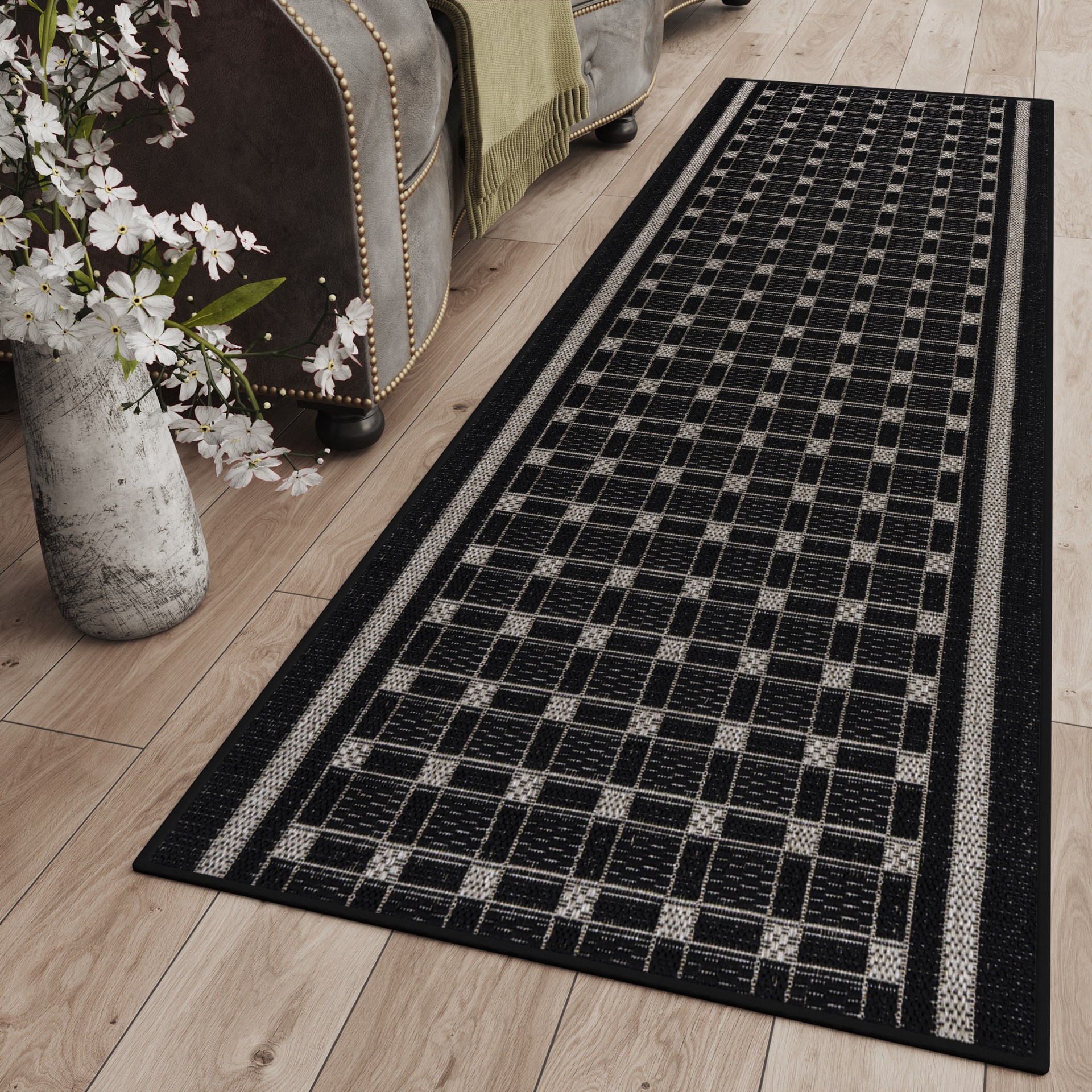 Dominują tutaj odcienie beżu, brązu, szarości oraz czerni, często w formie subtelnych wzorów, ramek czy geometrycznych kompozycji. Dzięki temu chodniki są eleganckie, ale jednocześnie uniwersalne i łatwe do dopasowania do różnych aranżacji.