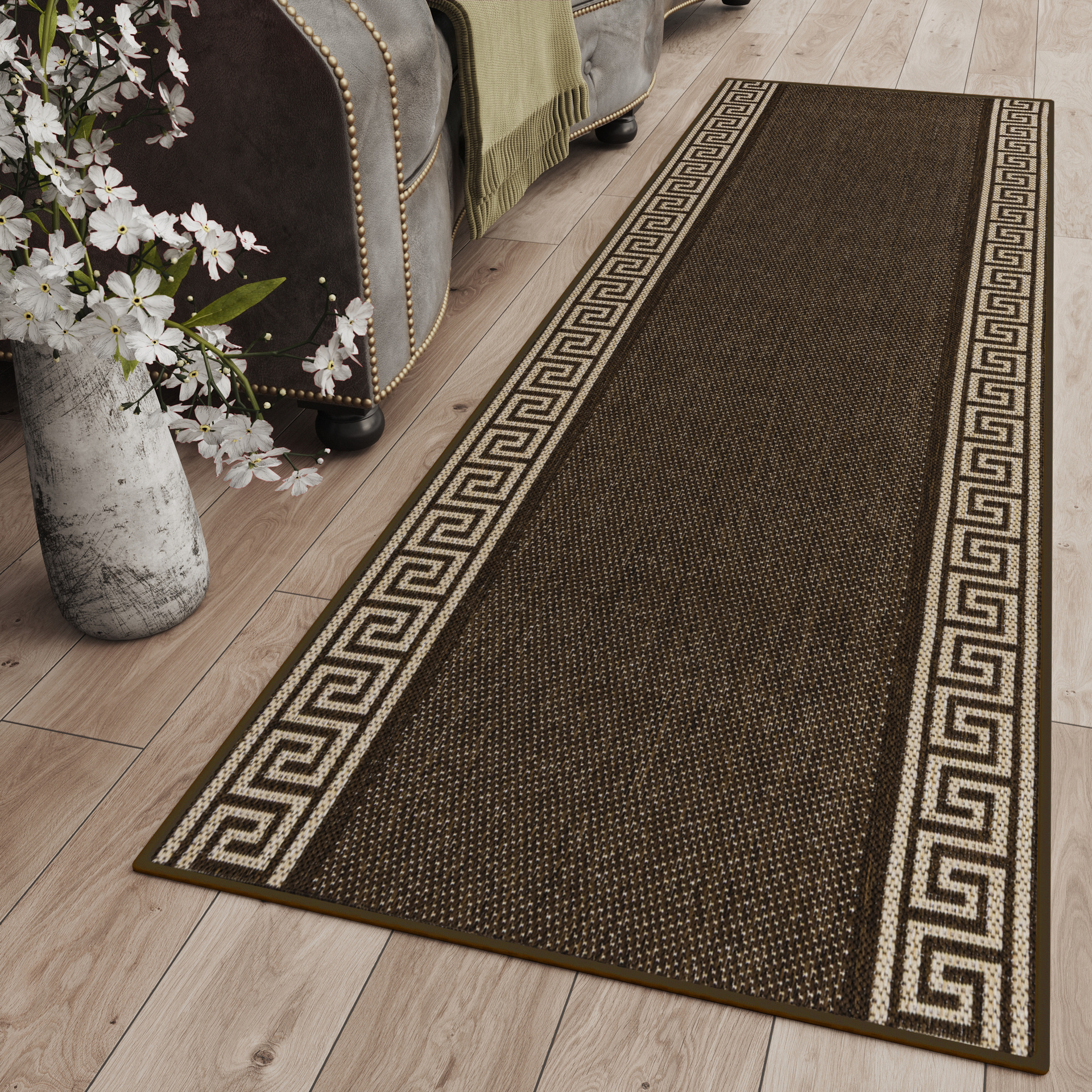 Dominują tutaj odcienie beżu, brązu, szarości oraz czerni, często w formie subtelnych wzorów, ramek czy geometrycznych kompozycji. Dzięki temu chodniki są eleganckie, ale jednocześnie uniwersalne i łatwe do dopasowania do różnych aranżacji.
