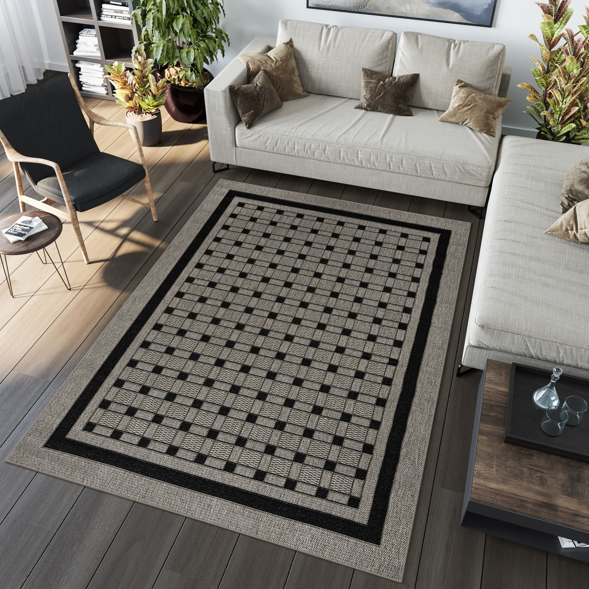 Dominują tutaj odcienie beżu, brązu, szarości oraz czerni, często w formie subtelnych wzorów, ramek czy geometrycznych kompozycji. Dzięki temu dywany są eleganckie, ale jednocześnie uniwersalne i łatwe do dopasowania do różnych aranżacji.