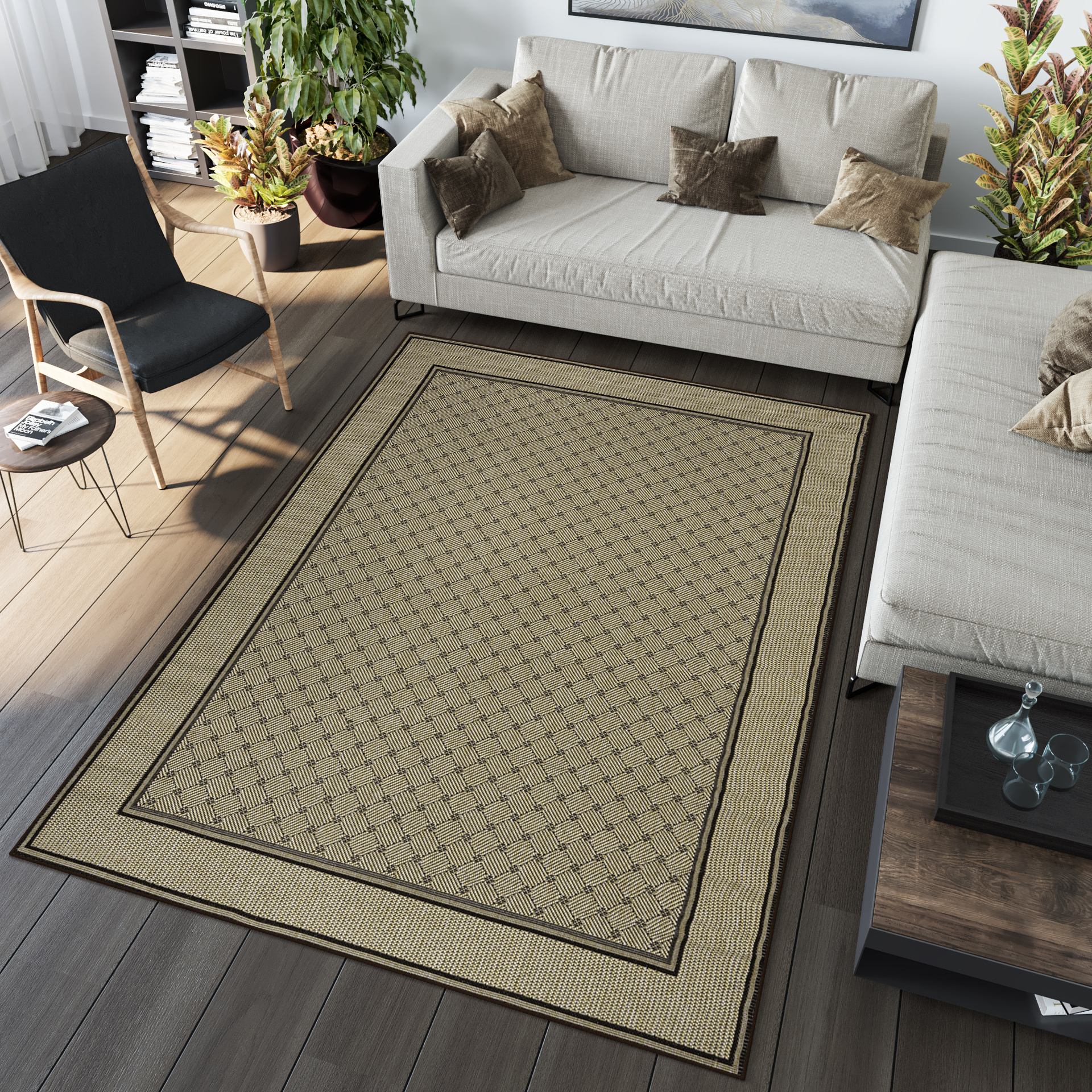 Dominują tutaj odcienie beżu, brązu, szarości oraz czerni, często w formie subtelnych wzorów, ramek czy geometrycznych kompozycji. Dzięki temu dywany są eleganckie, ale jednocześnie uniwersalne i łatwe do dopasowania do różnych aranżacji.