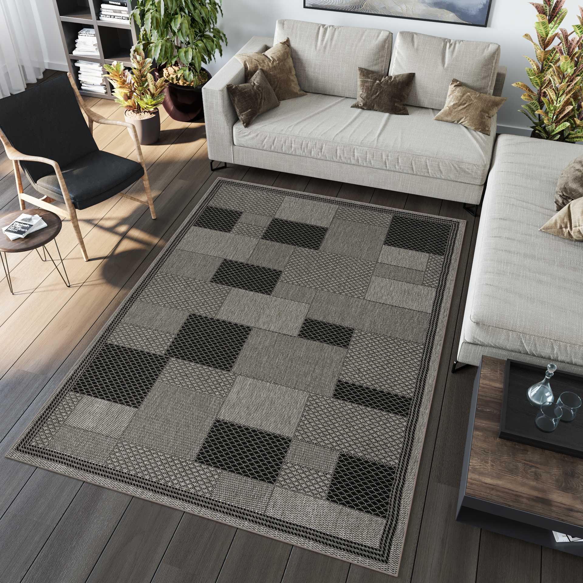 Dominują tutaj odcienie beżu, brązu, szarości oraz czerni, często w formie subtelnych wzorów, ramek czy geometrycznych kompozycji. Dzięki temu dywany są eleganckie, ale jednocześnie uniwersalne i łatwe do dopasowania do różnych aranżacji.