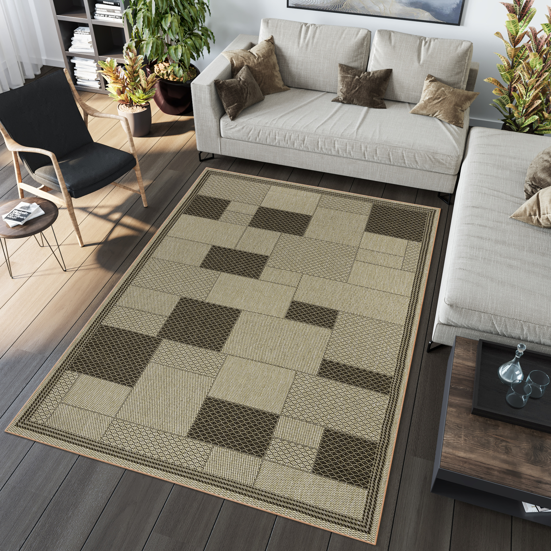 Dominują tutaj odcienie beżu, brązu, szarości oraz czerni, często w formie subtelnych wzorów, ramek czy geometrycznych kompozycji. Dzięki temu dywany są eleganckie, ale jednocześnie uniwersalne i łatwe do dopasowania do różnych aranżacji.