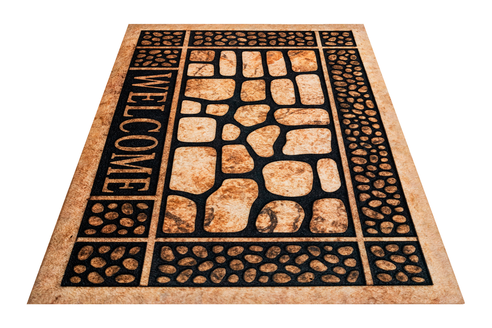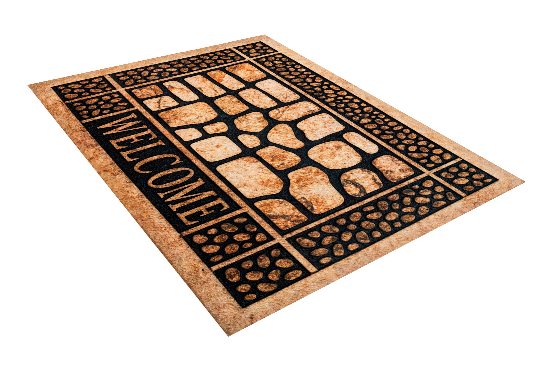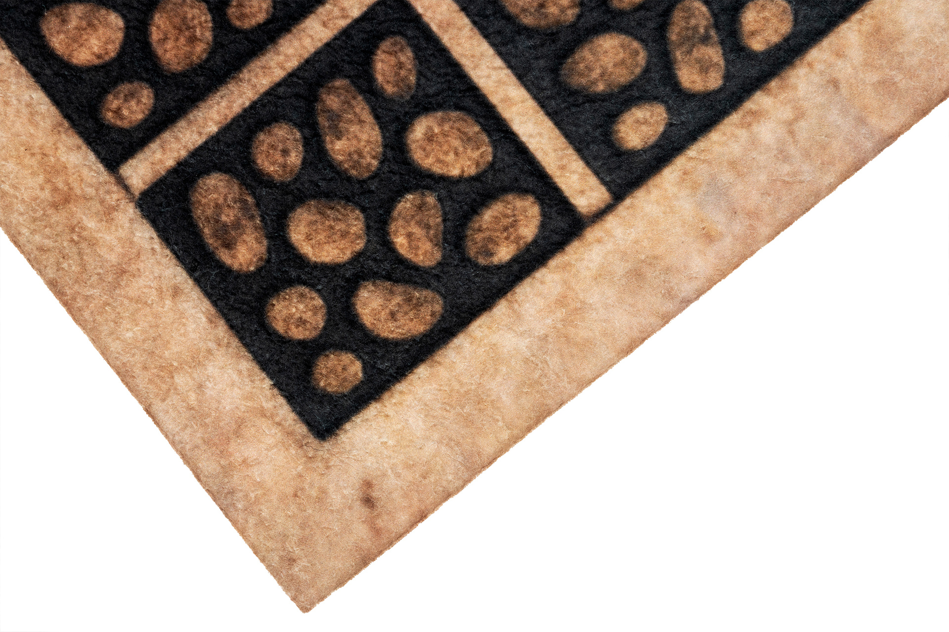 Wierzch wykonany jest z poliestrowego włókna z wyraźnym, estetycznym nadrukiem - dzięki czemu wycieraczka jest nie tylko praktyczna, ale również stanowi element wystroju. Na spodzie znajduje się antypoślizgowa guma, która stabilnie trzyma się podłoża i zapobiega przesuwaniu się maty podczas użytkowania.