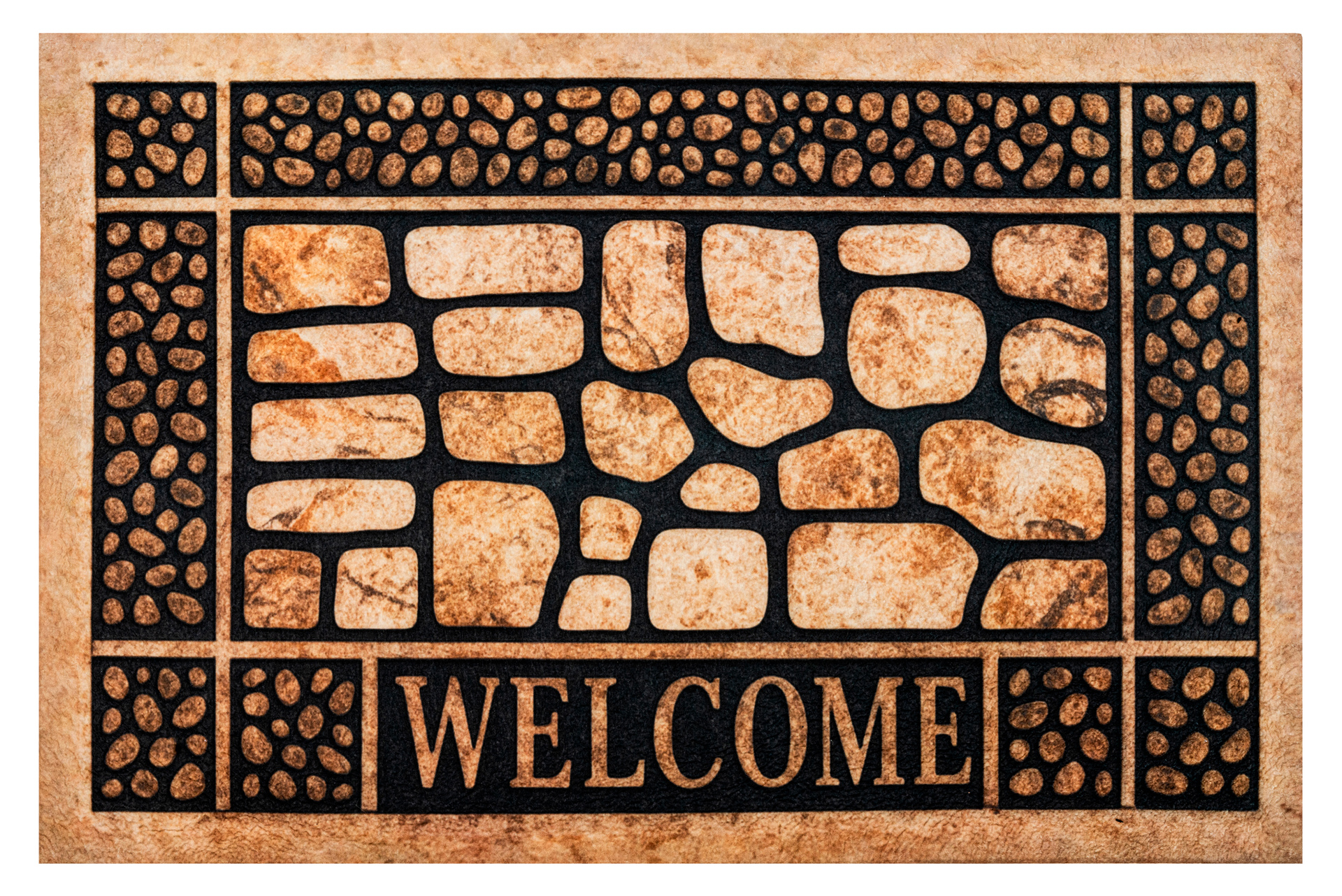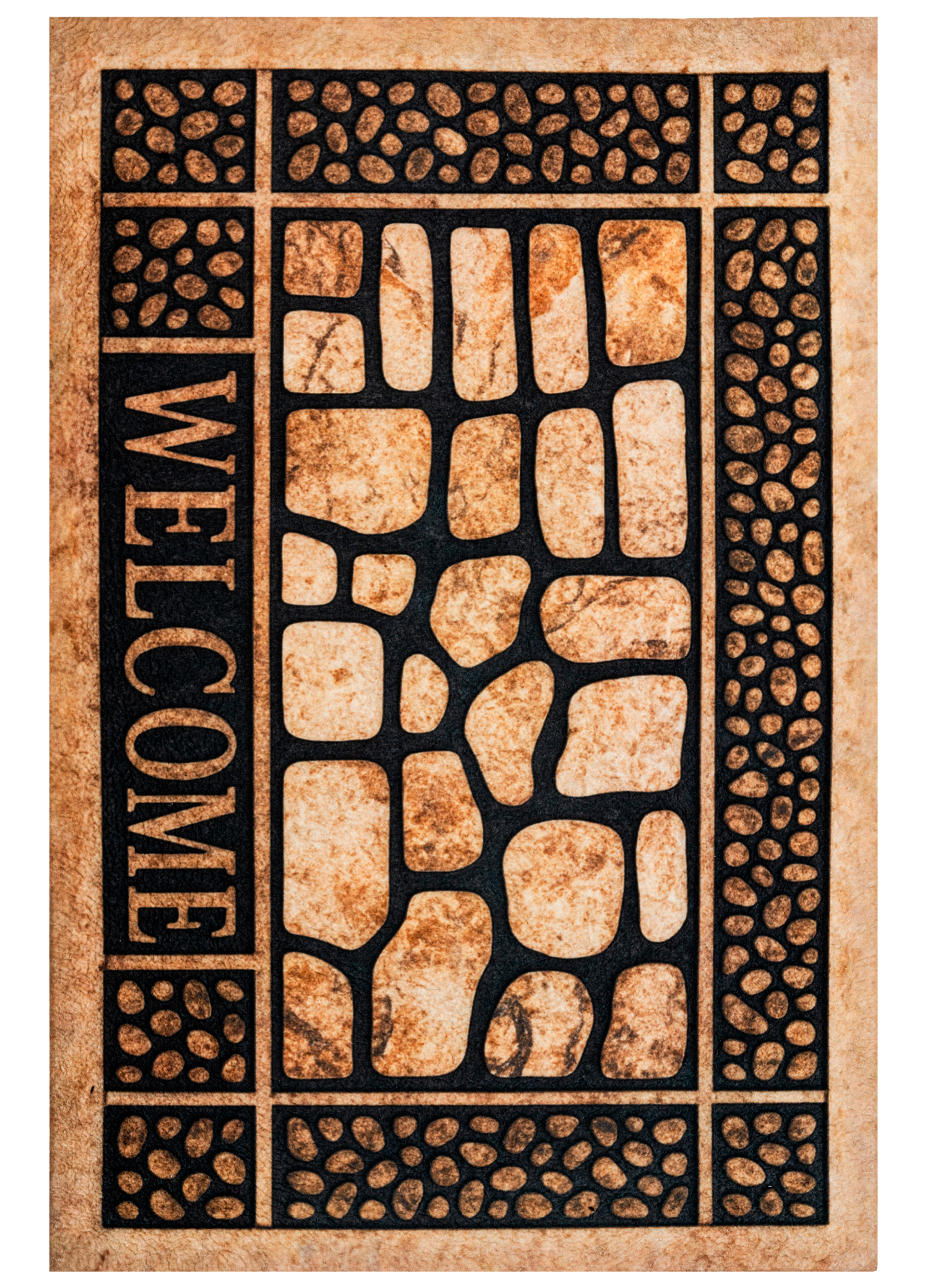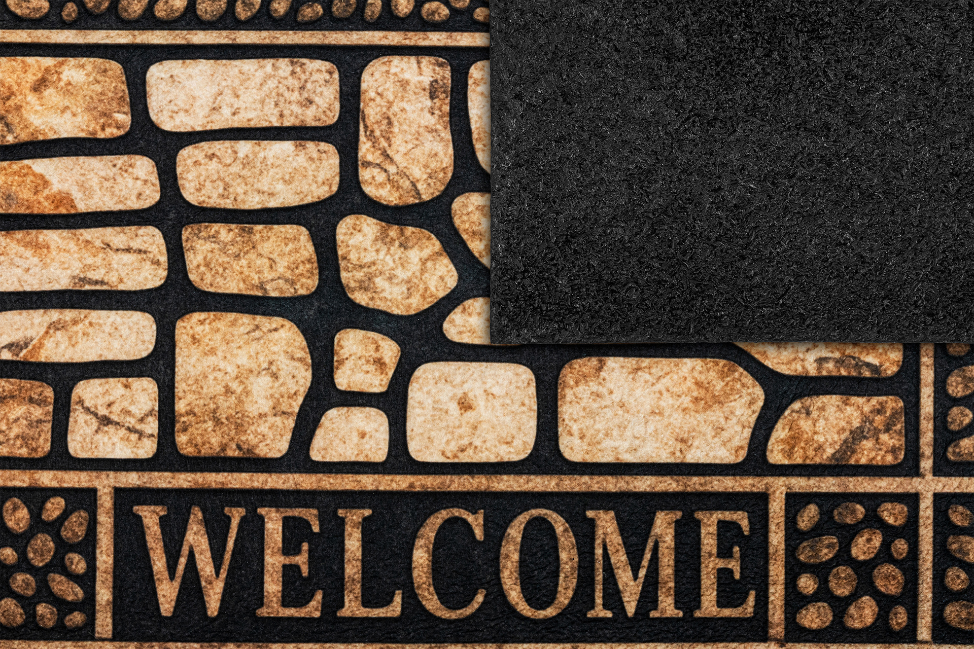 Wierzch wykonany jest z poliestrowego włókna z wyraźnym, estetycznym nadrukiem - dzięki czemu wycieraczka jest nie tylko praktyczna, ale również stanowi element wystroju. Na spodzie znajduje się antypoślizgowa guma, która stabilnie trzyma się podłoża i zapobiega przesuwaniu się maty podczas użytkowania.
