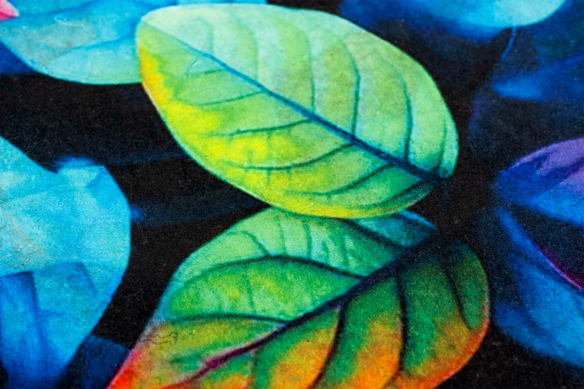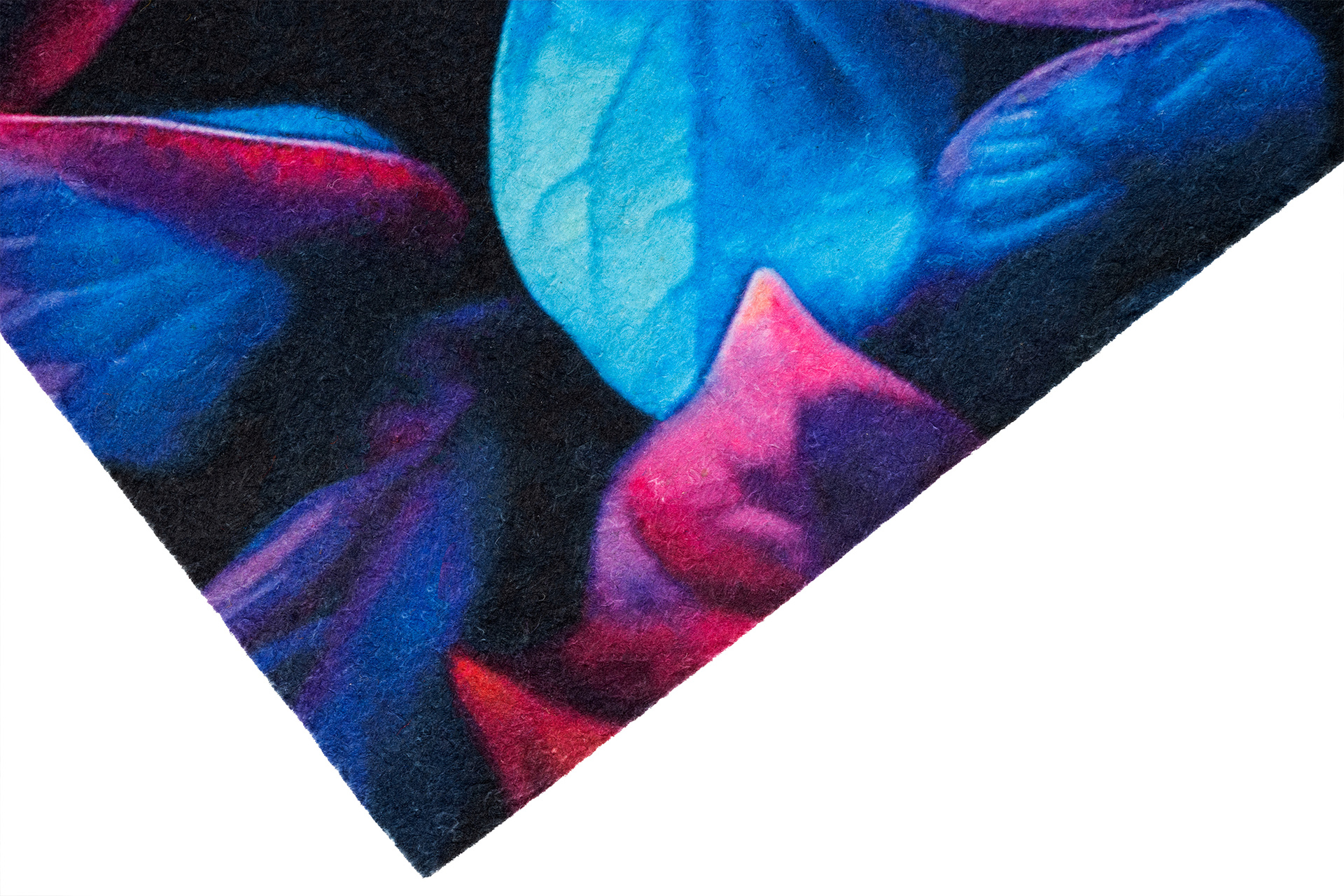 Wierzch wykonany jest z poliestrowego włókna z wyraźnym, estetycznym nadrukiem - dzięki czemu wycieraczka jest nie tylko praktyczna, ale również stanowi element wystroju. Na spodzie znajduje się antypoślizgowa guma, która stabilnie trzyma się podłoża i zapobiega przesuwaniu się maty podczas użytkowania.